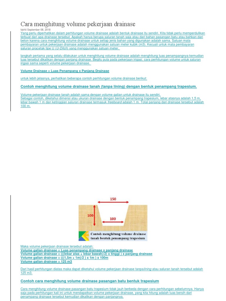 . Volume galian tanah pada saluran air lama cara menghitung volume pembuatan saluran batu kali menghitung volume pekerjaan academia edu cara menghitung volume pembuatan saluran batu kali blog apa saja boleh drainase bawah tanah smb project contoh metoda pelaksanaan drainase cara menghitung volume beton per m3. Volume Urugan Tanah Kembali. Pertama-tama Anda harus menentukan penetapan volume gorong-gorong beton yaitu dengan cara menghitung luas dari bentuk dasar beton tersebut.